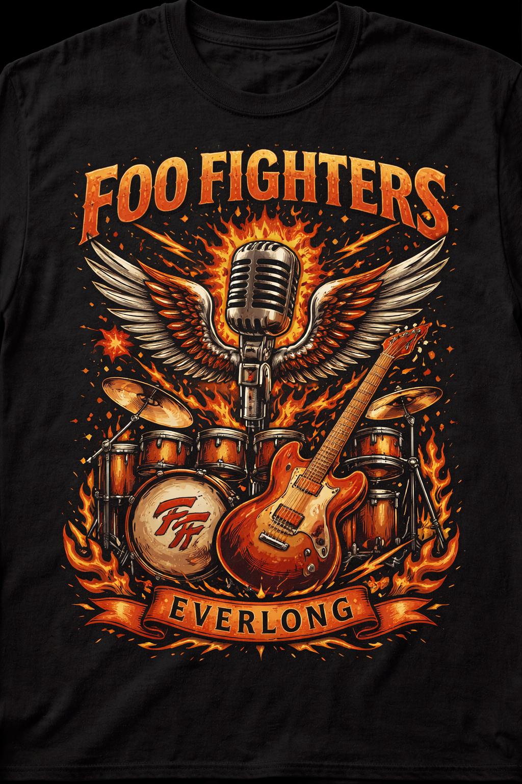 El nombre Foo Fighters destaca en tipografía estilo vintage con acabado ardiente, mientras que la frase “Everlong” complementa el diseño como homenaje a uno de sus himnos más icónicos.